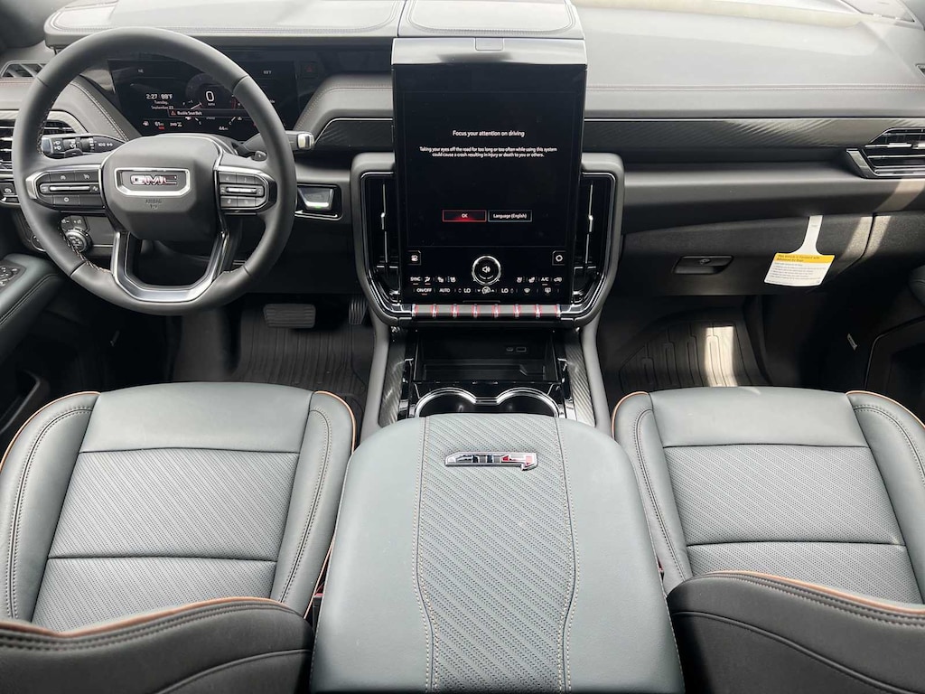 AT4 PREMIUM PACKAGE includes (CWM) Technology Package, (C3U) Panoramic power sunroof and (B3L) power-retractable assist steps with perimeter lighting, TECHNOLOGY PACKAGE includes (DRZ) Rear Camera Mirror and (UV6) Head-Up Display (Also includes (NWM) Advanced Security Package content, (ATN) second row power bucket seats and (DCH) power-sliding center console. LPO, FLOOR LINER PACKAGE (dealer-installed) (Includes (RIA) 1st and 2nd row all-weather floor liners, LPO, (RIB) 3rd row all-weather floor liners, LPO and (CAV) all-weather cargo mat, LPO. ENGINE, 5.3L ECOTEC3 V8 with Dynamic Fuel Management, Direct Injection and Variable Valve Timing, includes aluminum block construction (355 hp [265 kW] @ 5600 rpm, 383 lb-ft of torque [518 Nm] @ 4100 rpm) (STD), TRANSMISSION, 10-SPEED AUTOMATIC electronically controlled with overdrive, includes Traction Select System including tow/haul (STD), ADVANCED SECURITY PACKAGE includes (UTR) self-powered horn, (UTV) interior movement sensors, (UTU) vehicle inclination sensors, (UTW) glass break sensors in rear quarter glass and liftgate window and door and liftgate lock shields, AUDIO SYSTEM, 16.8" DIAGONAL PREMIUM GMC INFOTAINMENT SYSTEM with high contrast display and local backlight dimming, with Google built-in compatibility, including navigation capability, color touch-screen, multi-touch display, connected apps, personalized profiles for each driver's settings, and Natural Voice Recognition (STD). GMC AT4 with Sterling Metallic exterior and Forest Storm with Mahogany Accents interior features a 8 Cylinder Engine with 355 HP at 5600 RPM*.