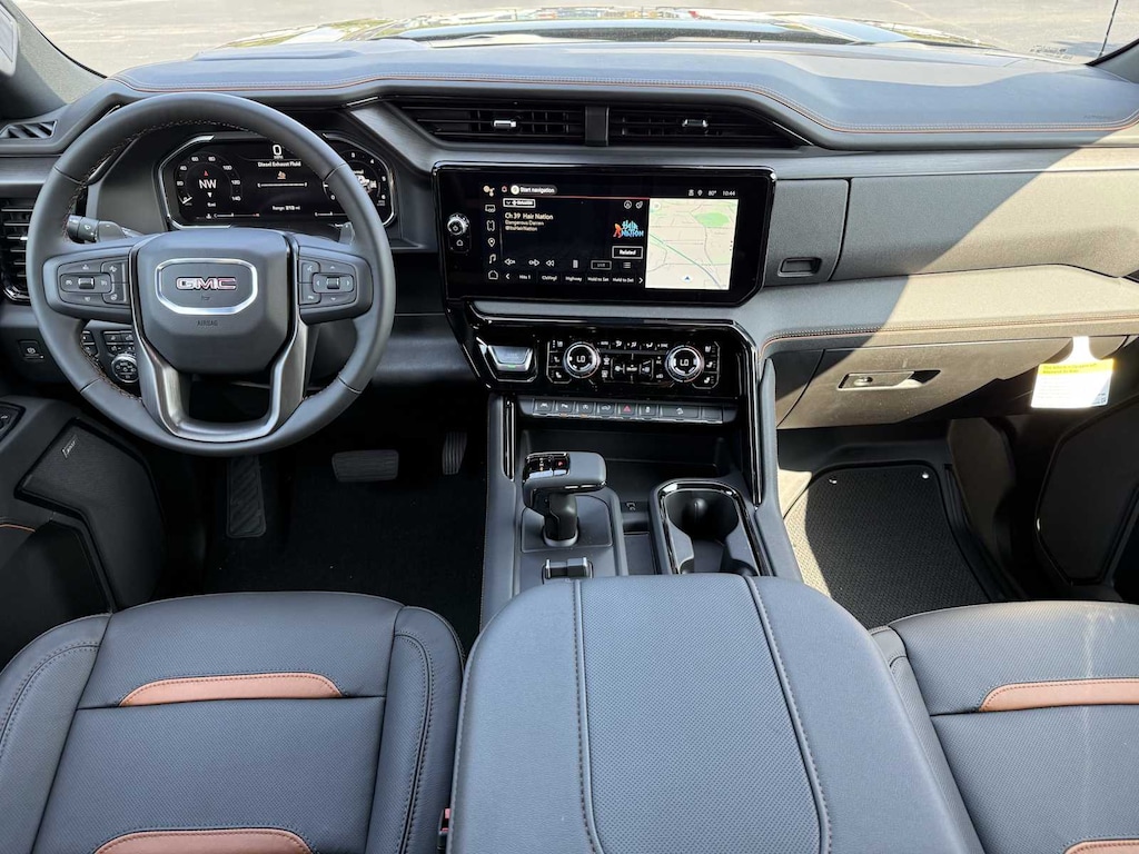 TECHNOLOGY PACKAGE includes (DRZ) Rear Camera Mirror and (UV6) Multicolor 15" Diagonal Head-Up Display (Includes (UVN) Bed View Camera.), AT4 PREFERRED PACKAGE includes (UG1) Universal Home Remote and (A48) rear sliding power window, AUDIO SYSTEM, 13.4" DIAGONAL PREMIUM GMC INFOTAINMENT SYSTEM WITH GOOGLE BUILT IN APPS SUCH AS NAVIGATION AND VOICE ASSISTANCE, INCLUDES COLOR TOUCH-SCREEN, MULTI-TOUCH DISPLAY, AM/FM STEREO Bluetooth® streaming audio for music and most phones; featuring wireless Android Auto® and Apple CarPlay® capability for compatible phones (STD), ENGINE, DURAMAX 3.0L TURBO-DIESEL I6 (305 hp [227 kW] @ 3750 rpm, 495 lb-ft of torque [671 Nm] @ 2750 rpm) (Includes (KW5) 220-amp alternator and (K05) engine block heater.) (STD), TRANSMISSION, 10-SPEED AUTOMATIC WITH ELECTRONIC PRECISION SHIFT, ELECTRONICALLY CONTROLLED with overdrive, tow/haul mode and steering column paddle shifters. Includes Cruise Grade Braking and Powertrain Grade Braking (STD). GMC AT4 with Onyx Black exterior and Jet Black with Kalahari accents interior features a Straight 6 Cylinder Engine with 305 HP at 3750 RPM*.