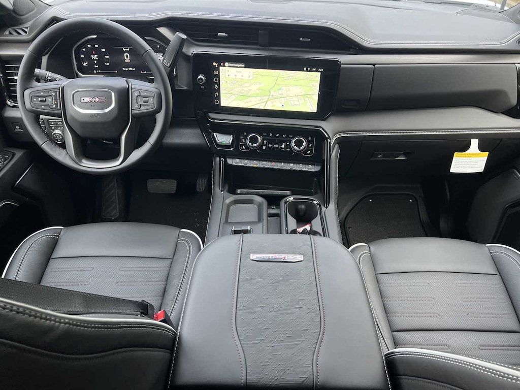 ENGINE, DURAMAX 6.6L TURBO-DIESEL V8, B20-DIESEL COMPATIBLE (470 hp [350.5 kW] @ 2800 rpm, 975 lb-ft of torque [1322 Nm] @ 1600 rpm) (Includes (K05) engine block heater.), AUDIO SYSTEM, 13.4" DIAGONAL PREMIUM GMC INFOTAINMENT SYSTEM WITH GOOGLE BUILT IN APPS SUCH AS NAVIGATION AND VOICE ASSISTANCE includes color touch-screen, multi-touch display, AM/FM stereo, Bluetooth® streaming audio for music and most phones; featuring wireless Android Auto® and Apple CarPlay® capability for compatible phones (STD), TRANSMISSION, 10-SPEED AUTOMATIC. GMC AT4X with Summit White exterior and Obsidian Rush interior features a 8 Cylinder Engine with 470 HP at 2800 RPM*.